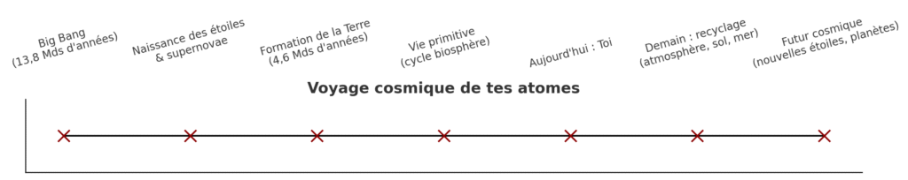 Une ligne du temps qui part du Big Bang, traverse les étoiles, la Terre, ton corps aujourd’hui, et se poursuit vers le recyclage et le futur cosmique.